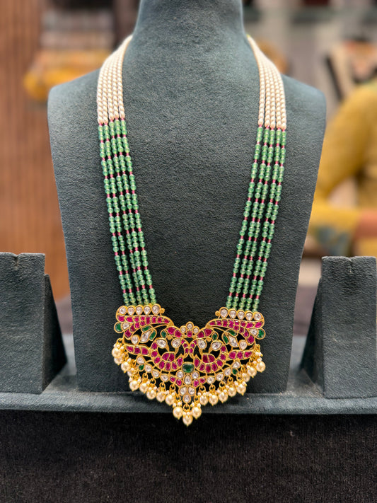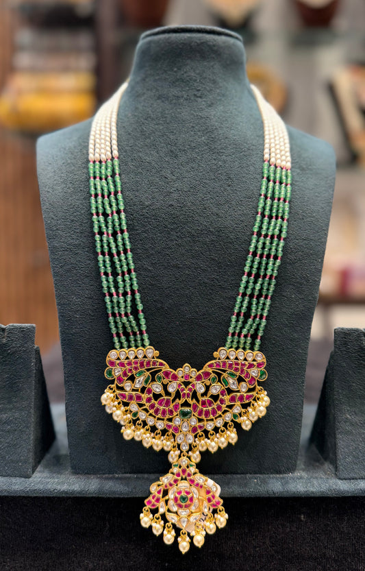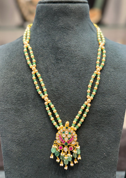 17691 4 Lines Pearls Mala With Victorian Pendent Set Green