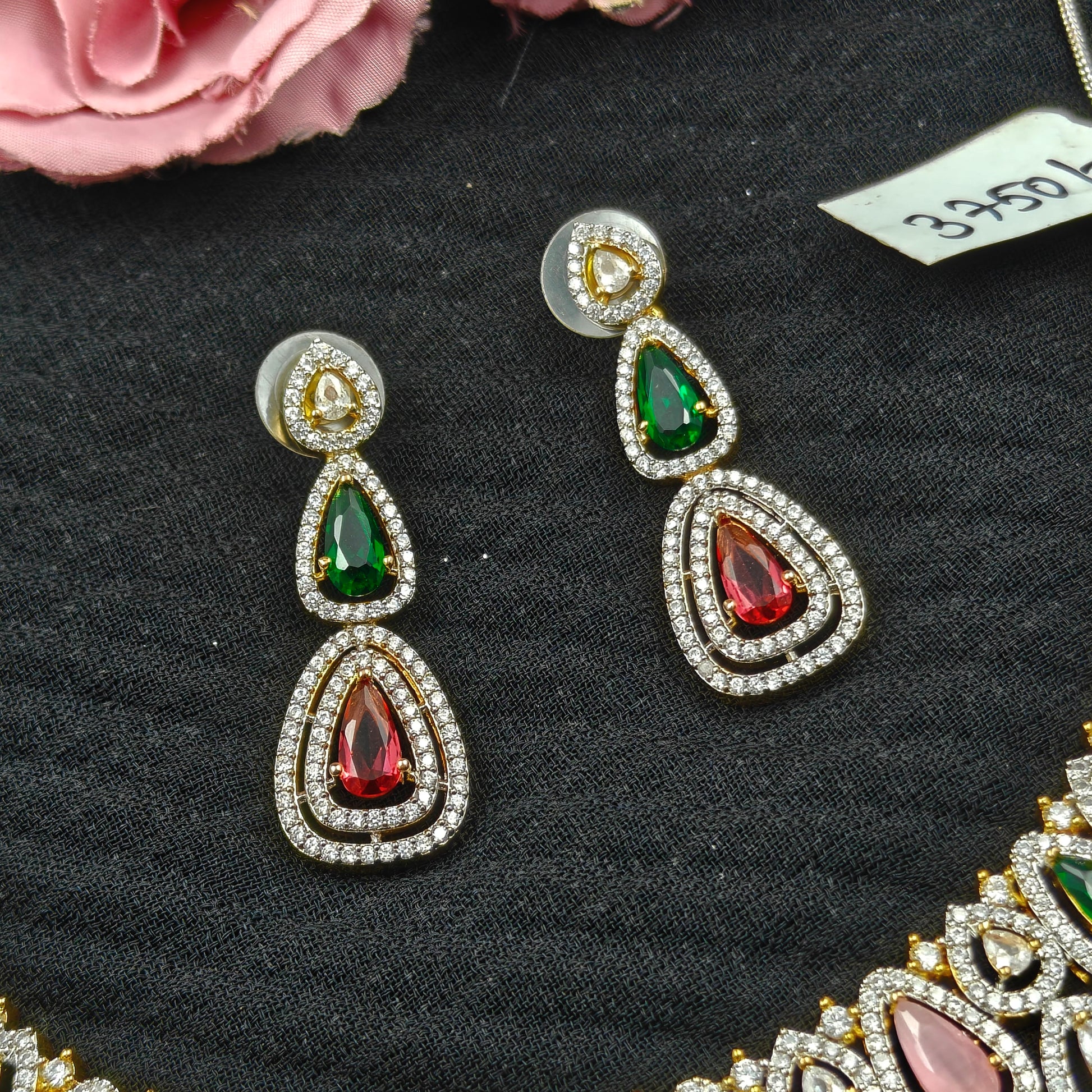 Expertly crafted with AD stones and premium Rodium polishing, our Diamond finish multicolor necklace boasts a stunning and unique design. Elevate any outfit with its sparkling multi-tone finish, adding just the right touch of elegance and style.