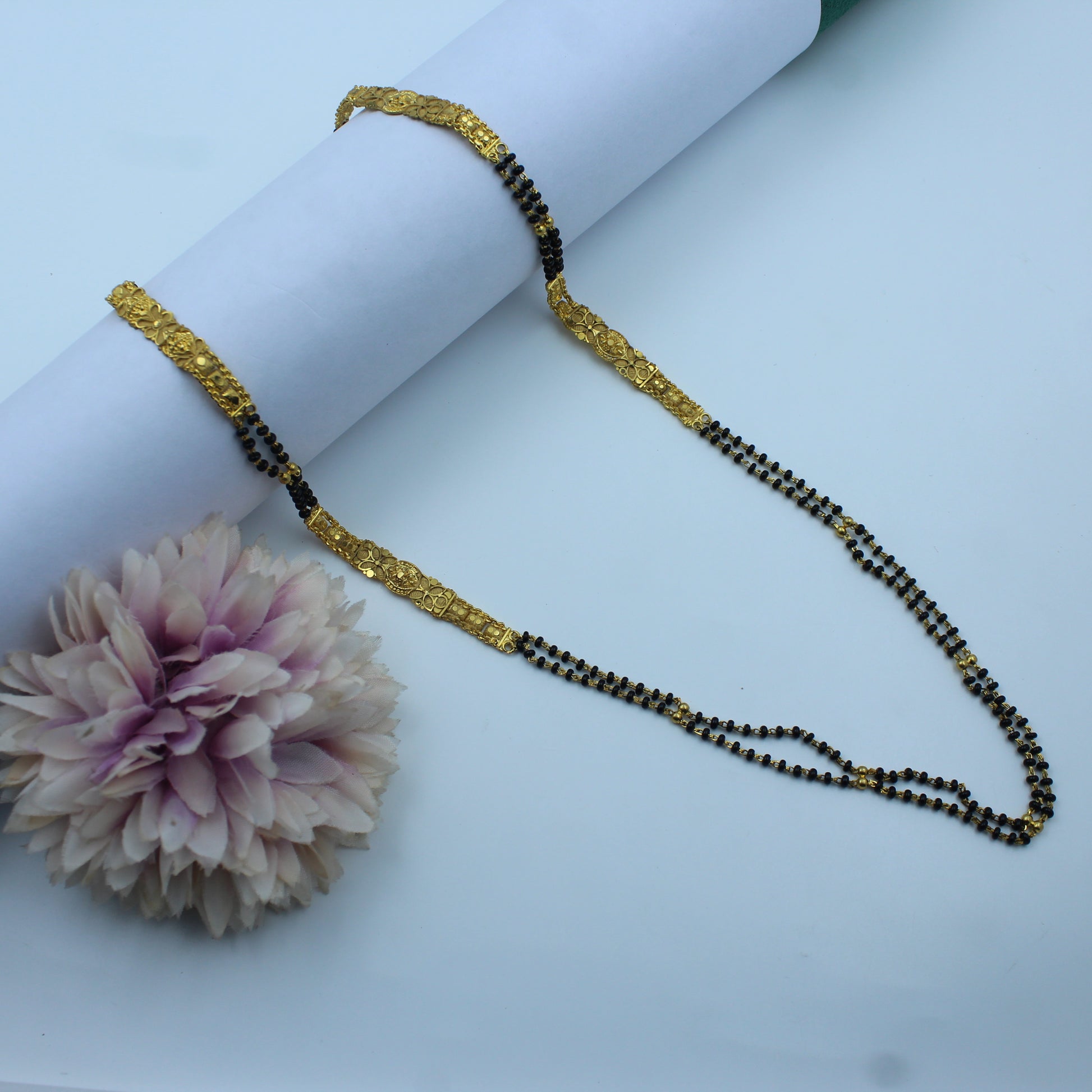 22246 Traditional Gold-Plated Black Bead Mangalsutra with Decorative Bar Design