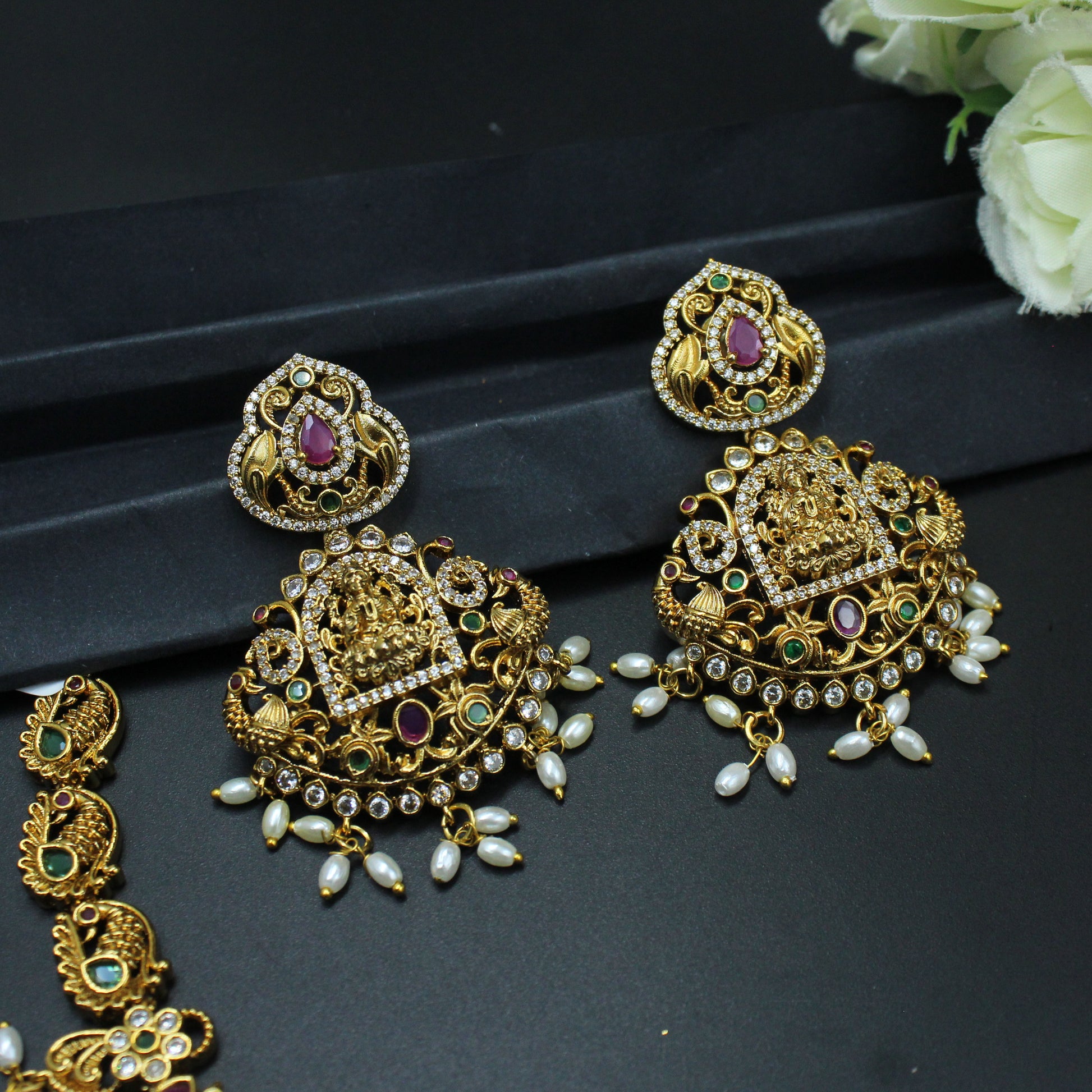 29470 Matte Lakshmi gold look necklace with rice pearls and screwback earrings