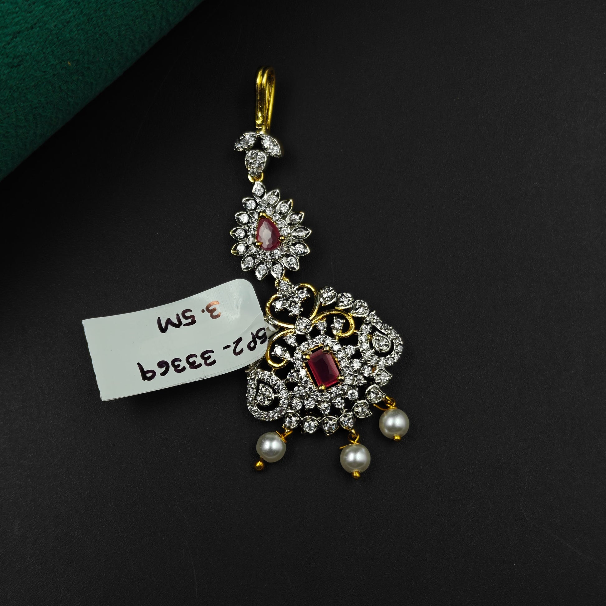 33369 Floral design maangtikka with red stones, white CZ crystals, and pearl drops