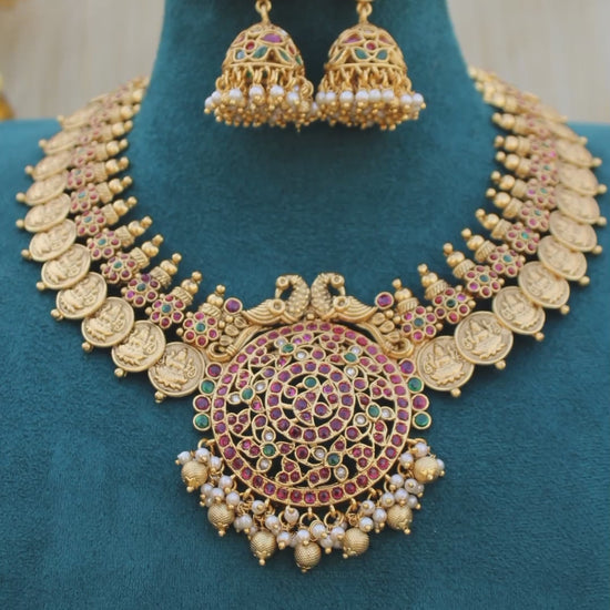 Bring home the essence of South Indian heritage with this exquisite Kasula Mala style necklace set. Designed with Lakshmi coin detailing, a grand circular pendant with twin peacocks, and elegant Jadau stone work in rich red and green tones, this set reflects timeless bridal tradition. The antique matte gold finish adds a royal charm, while the pearl drops with golden balls give it a graceful movement. Comes with perfectly matched temple-style jhumkas
