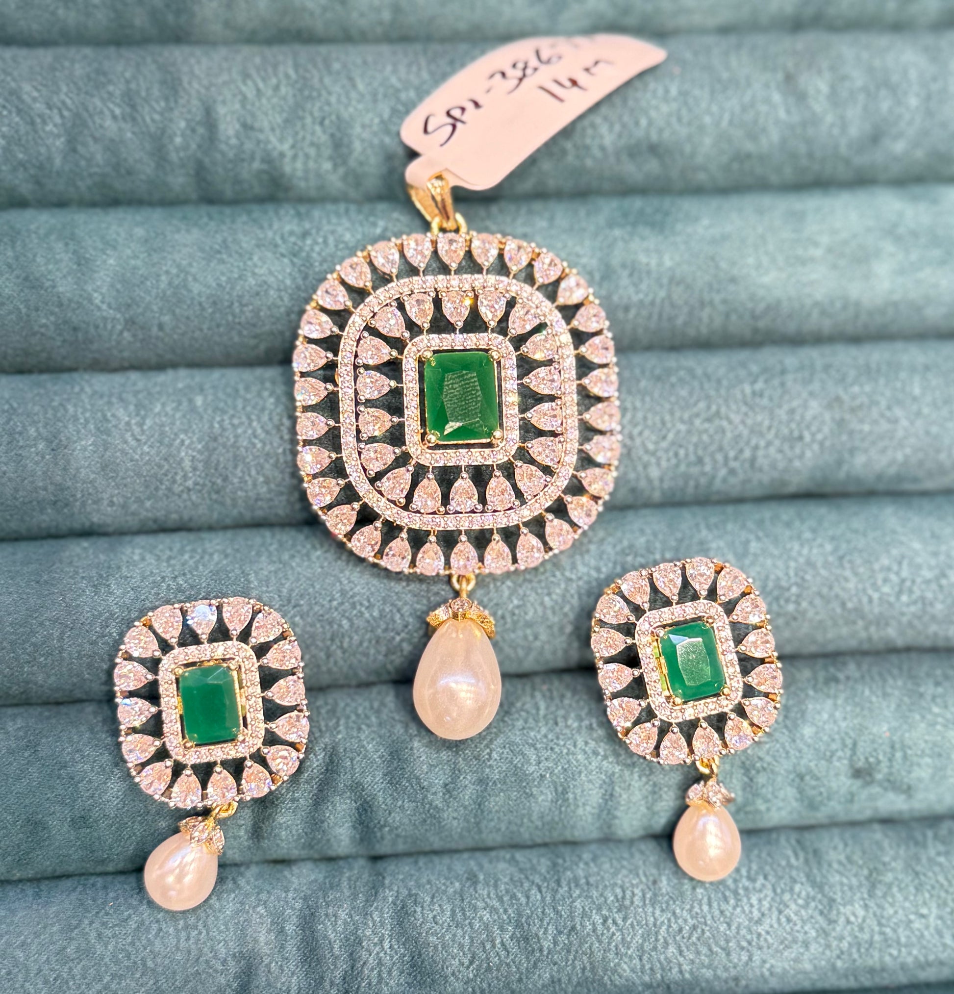 38677 real diamond look square shape pendant set green