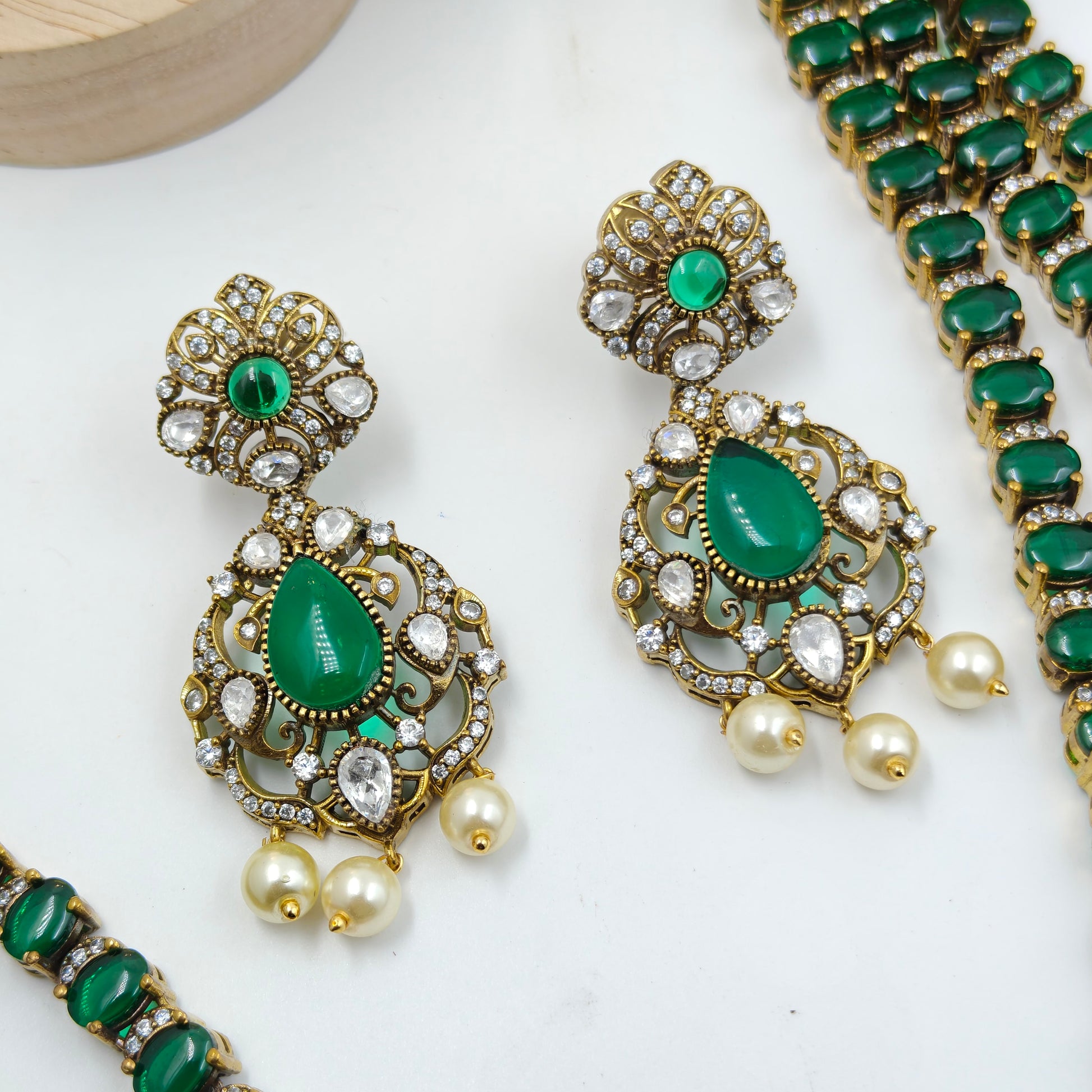 39286 - 3 Layers Victorian Moissanite Long Necklace Green Set