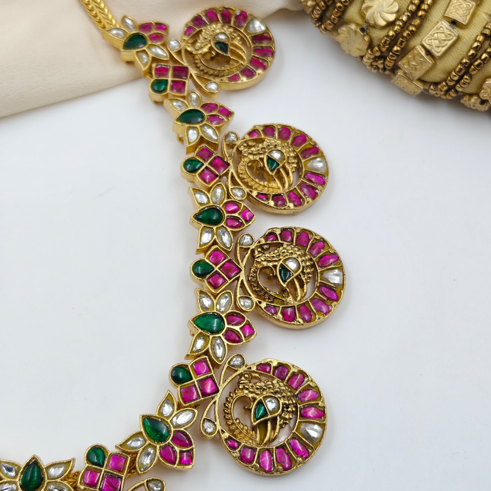 39741 Real Jadau Kundan hand setting stones Lakshmi and peacock hasli necklace