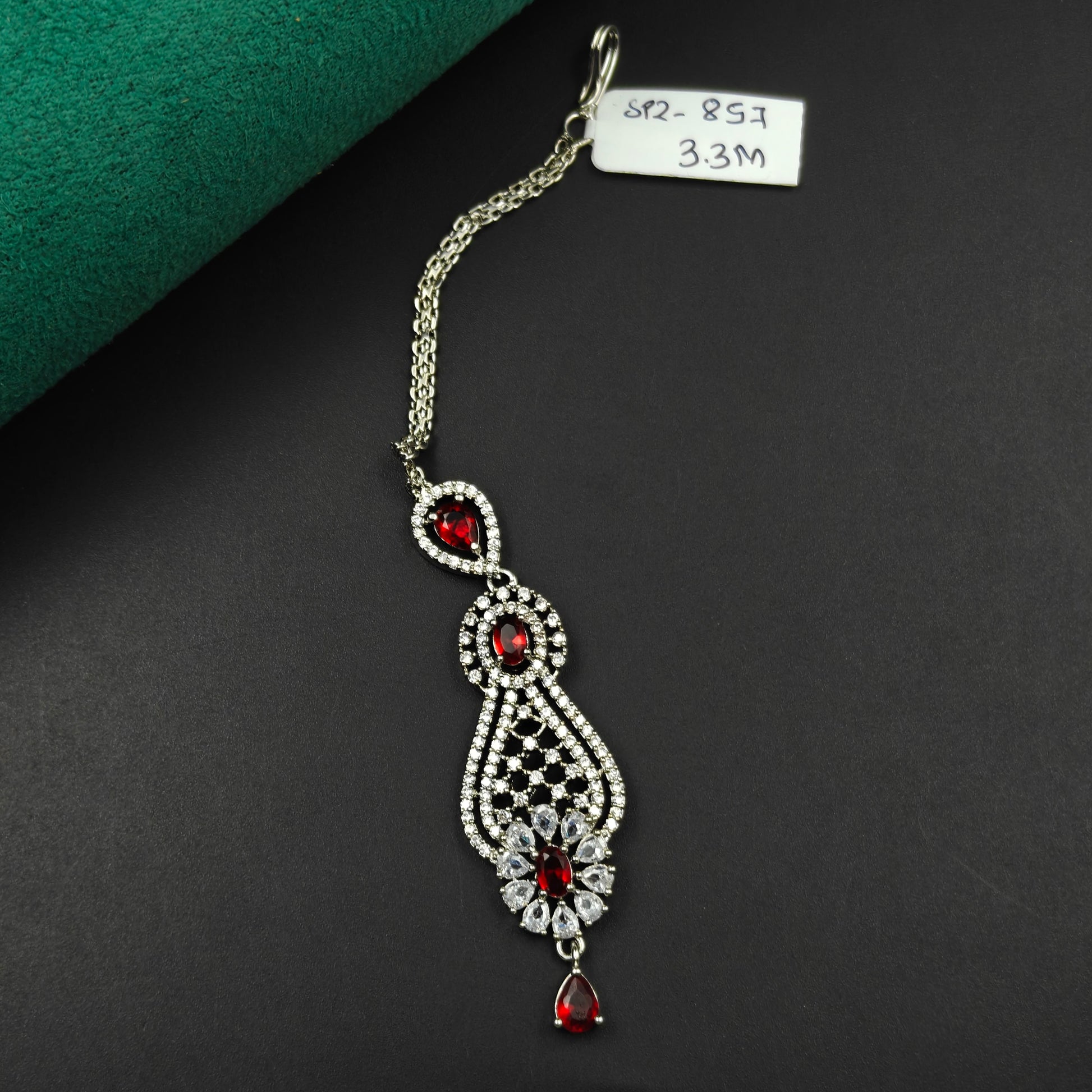 857 Elongated teardrop design maangtikka with red stones and white CZ crystals