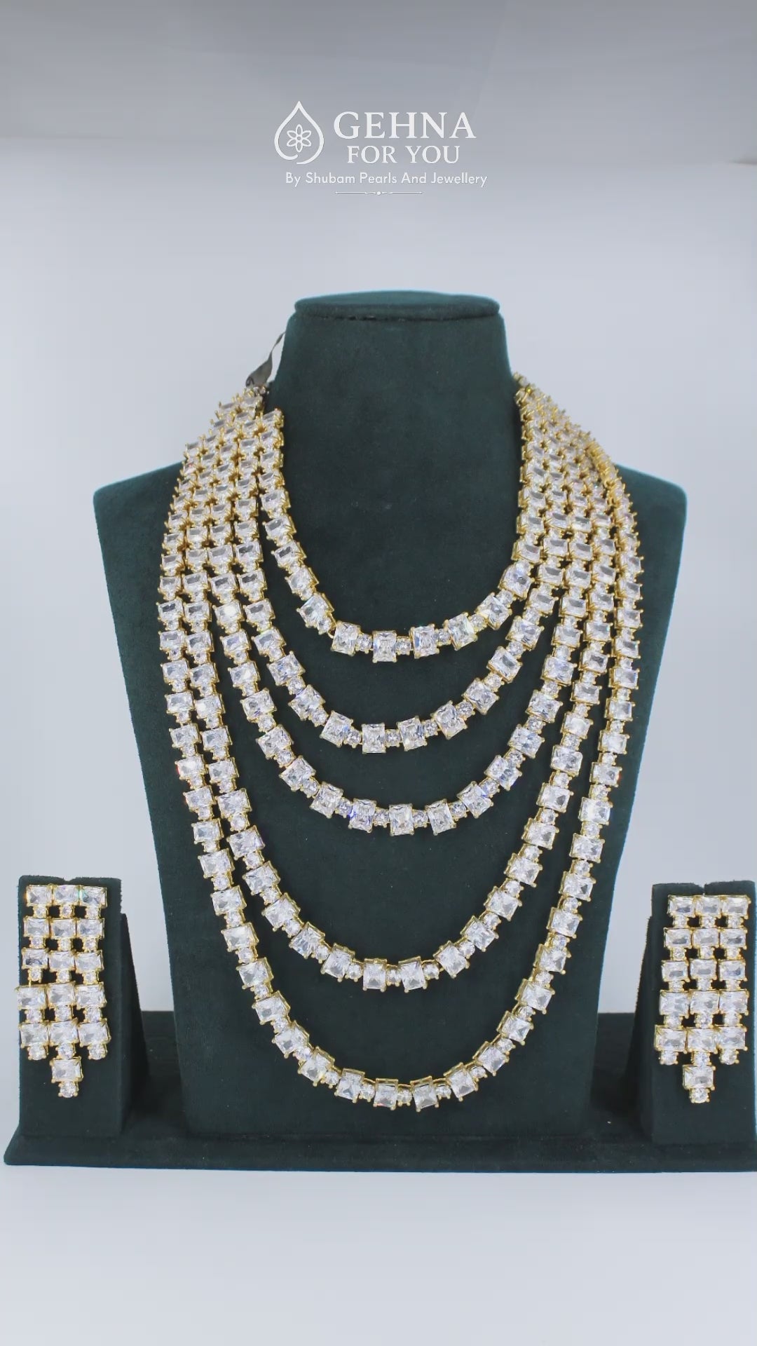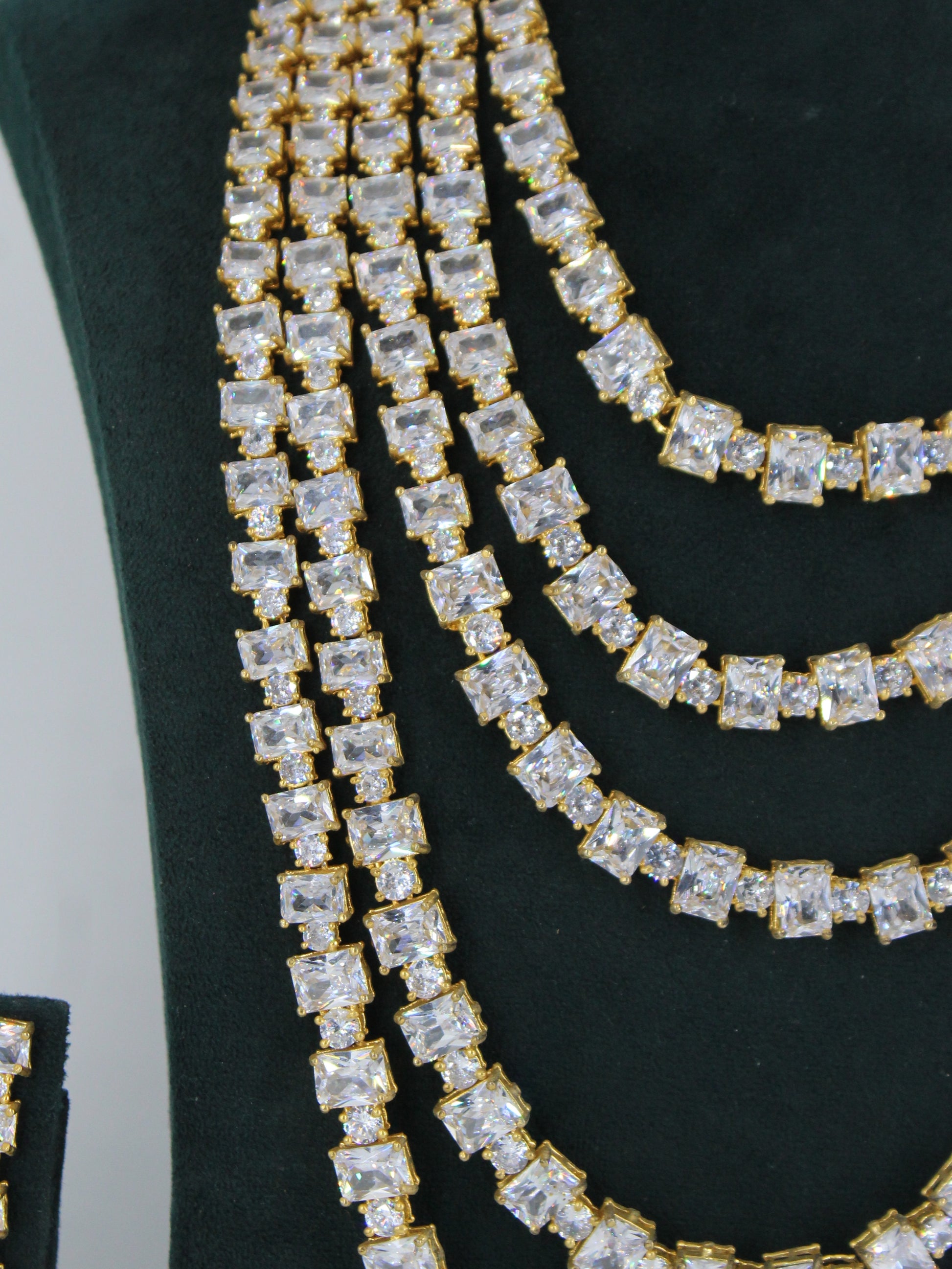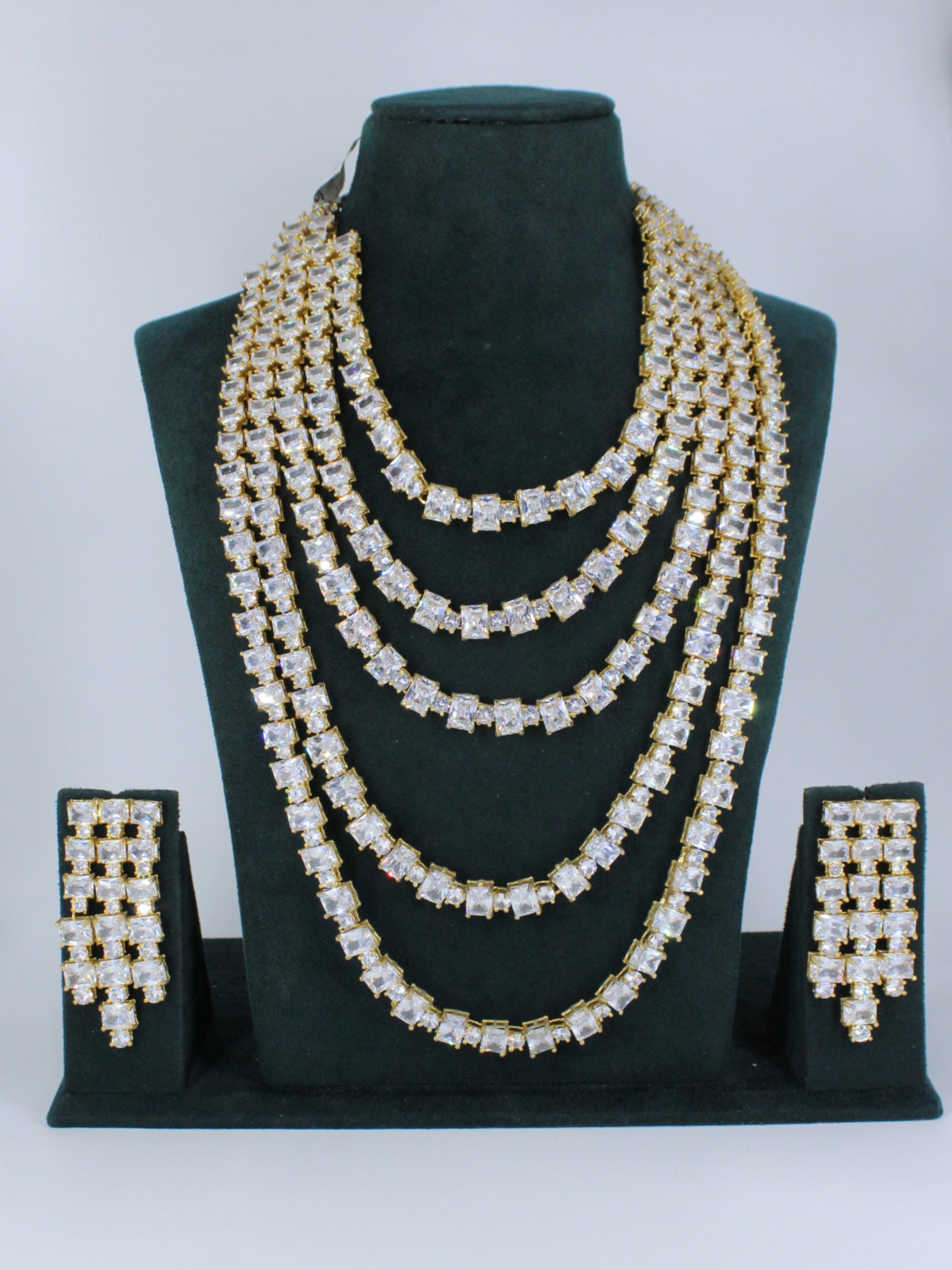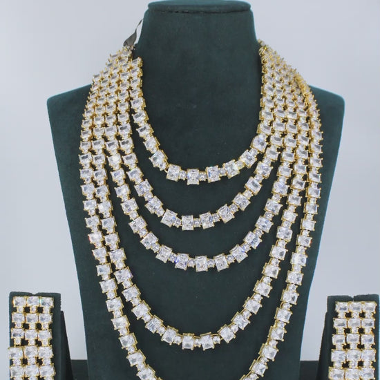 This multi-layered bridal necklace set is crafted with five layers of sparkling square-cut CZ stones, accented with round stone detailing and finished in a rich golden polish. The set comes with matching long earrings, designed to add grace and balance to your look. Lightweight yet luxurious, this necklace set blends traditional bridal elegance with a touch of modern sophistication.