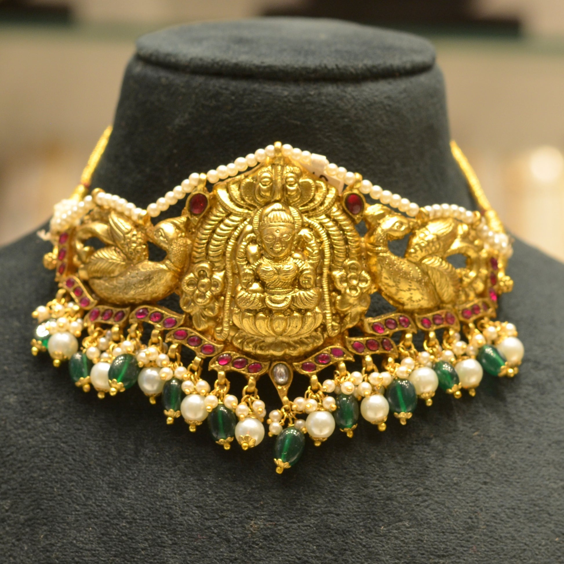 Jadau Nakshi finish laxmi choker with beads and pearls