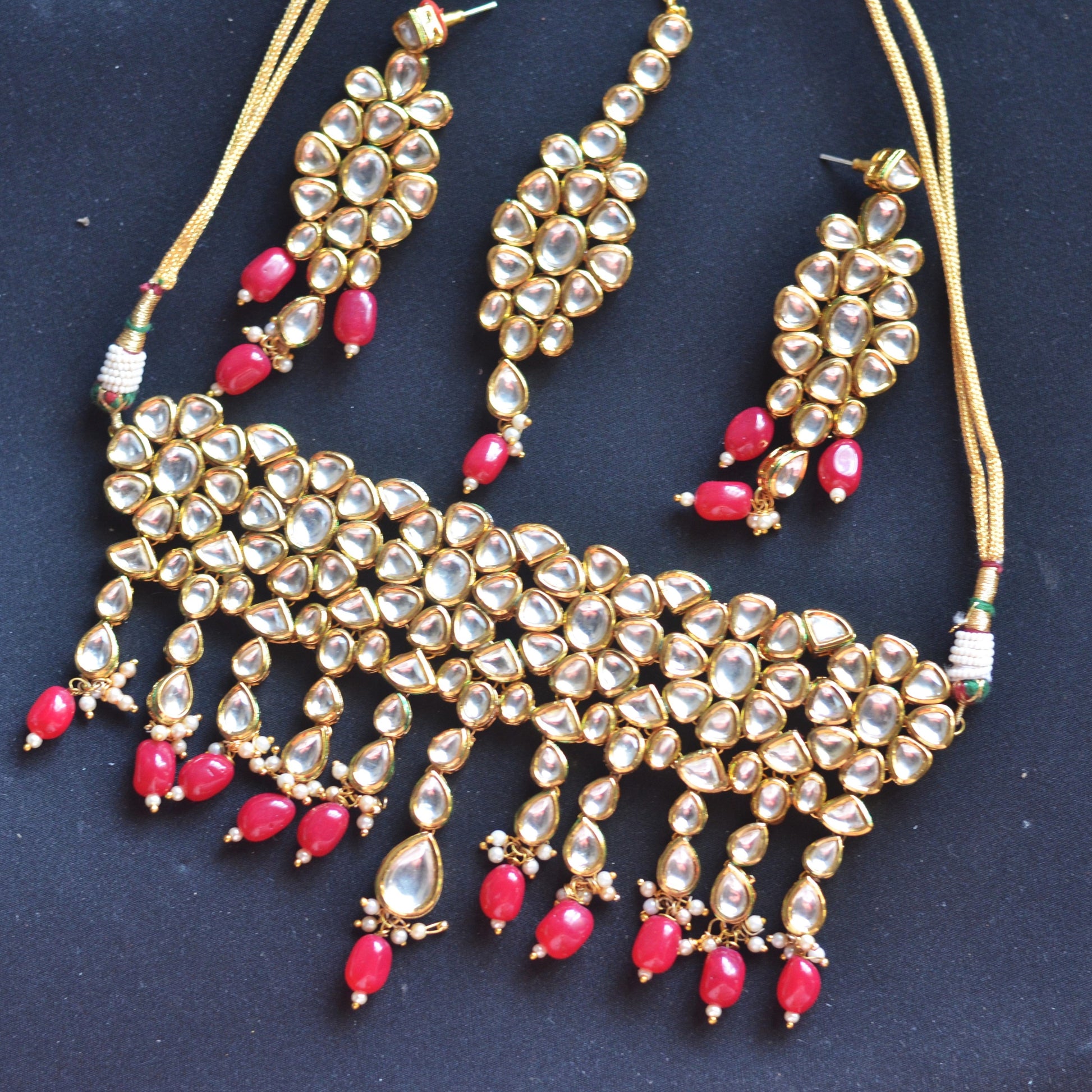 bridal Kundan Necklace with red beads , Earrings and maangtika